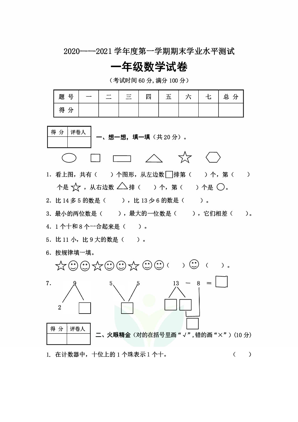 河北省张家口怀安县数学一年级第一学期期末试题 2020-2021学年(冀教版,含答案)