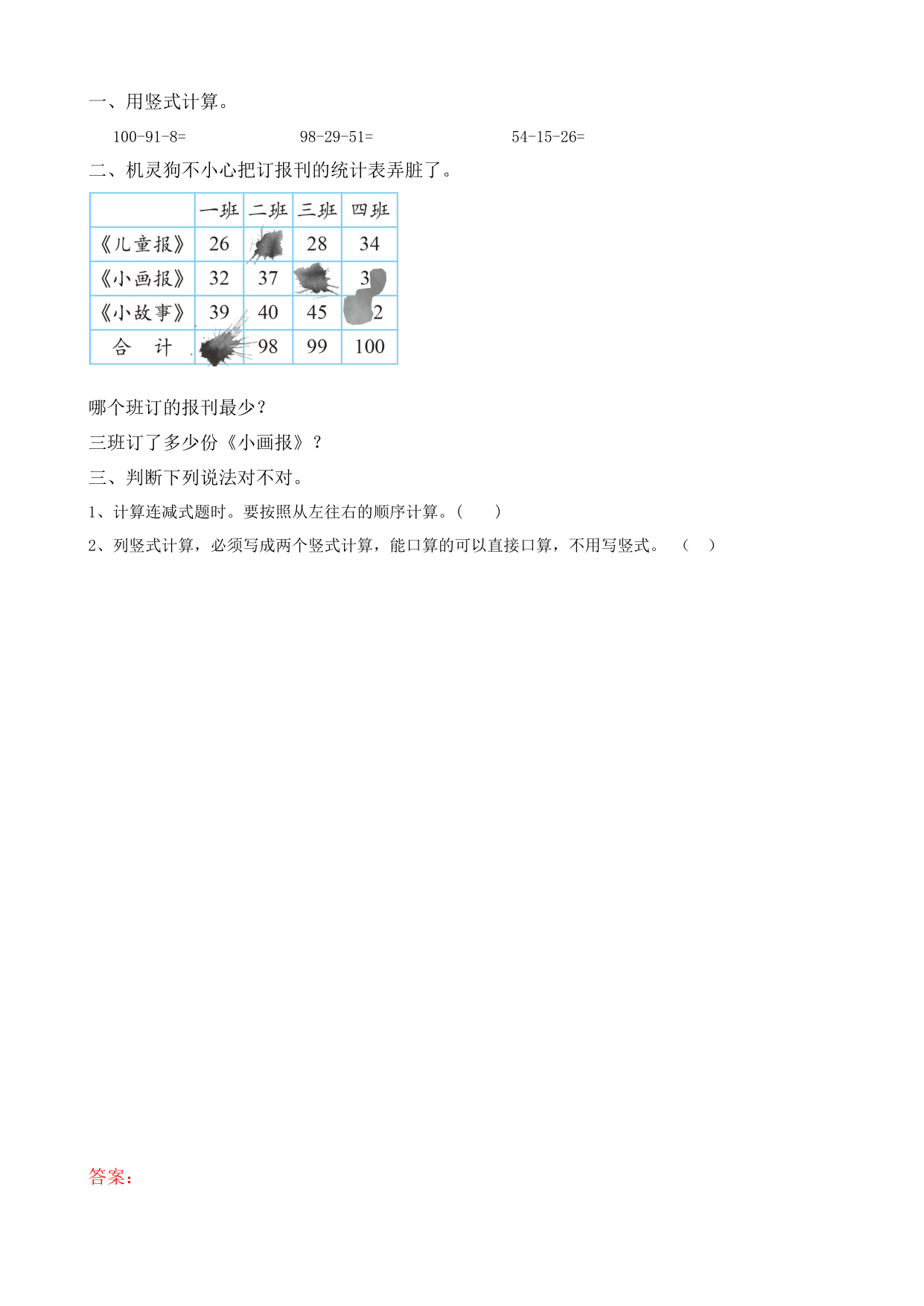 二上数学第一单元课时练-1-2 100以内数的连减运算