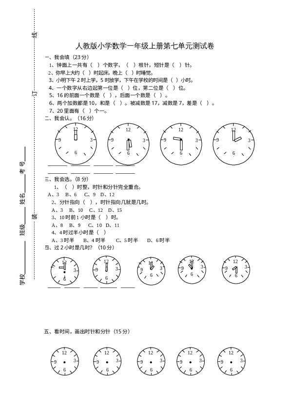 下一篇:人教版一年级上册数学第七单元《认识钟表》试卷2