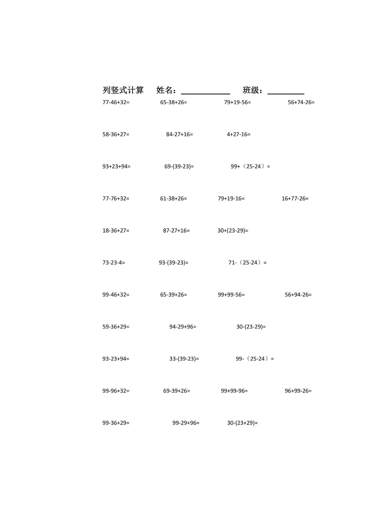 小学二年级上册上学期-数学100以内两位数加减混合运算列竖式计算题