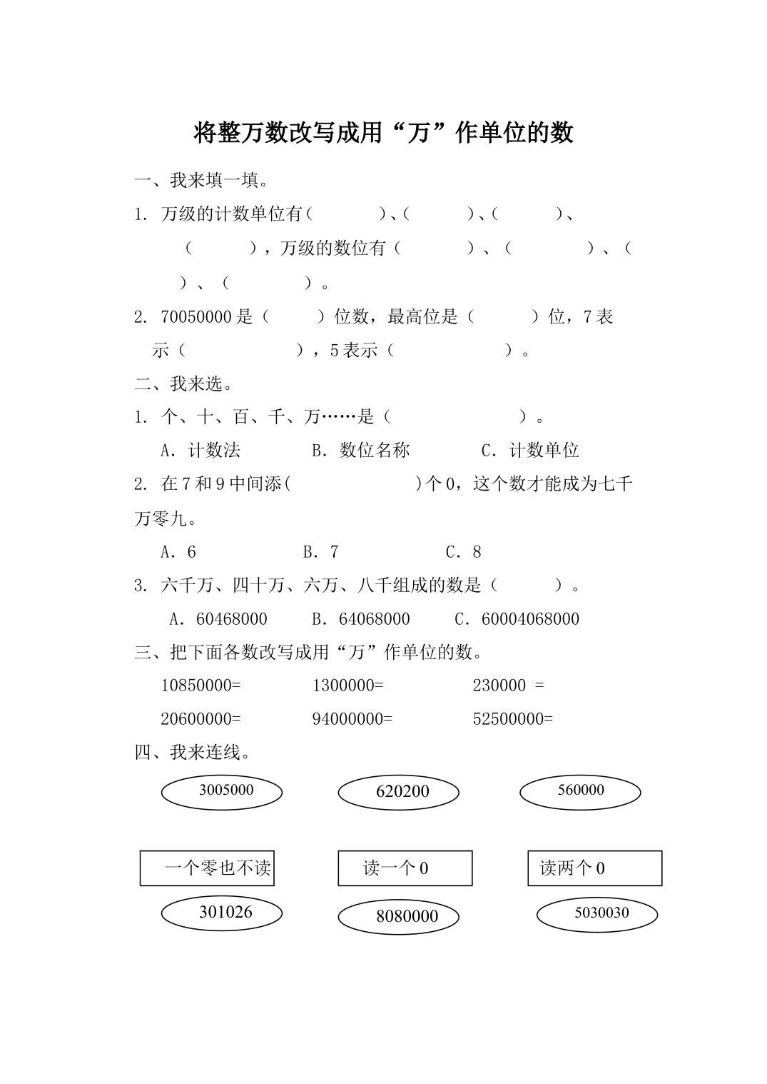 数学人教版四上课时练1-6 将整万数改写成用“万”作单位的数