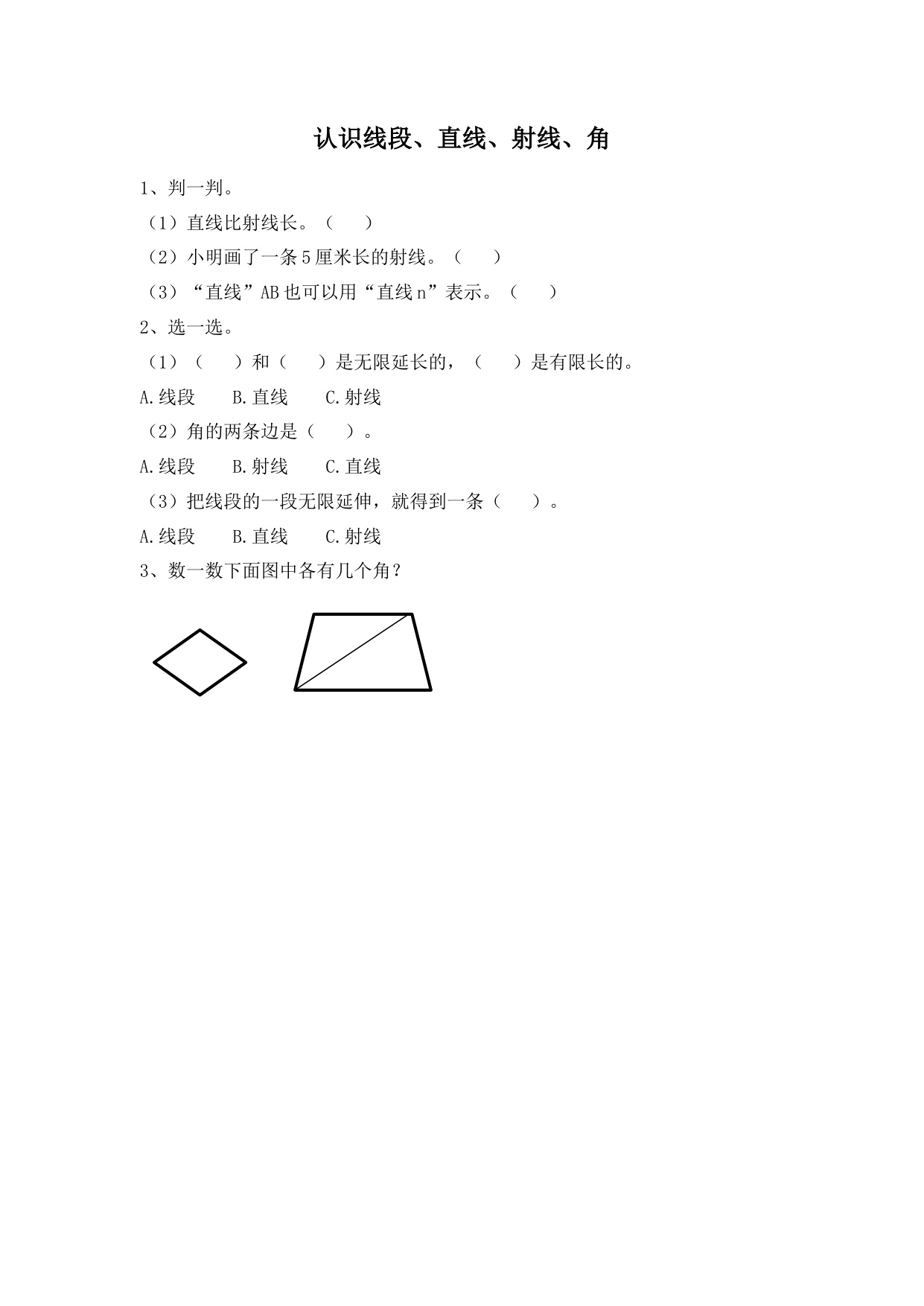 数学人教版四上课时练3-1 认识线段、直线、射线、角