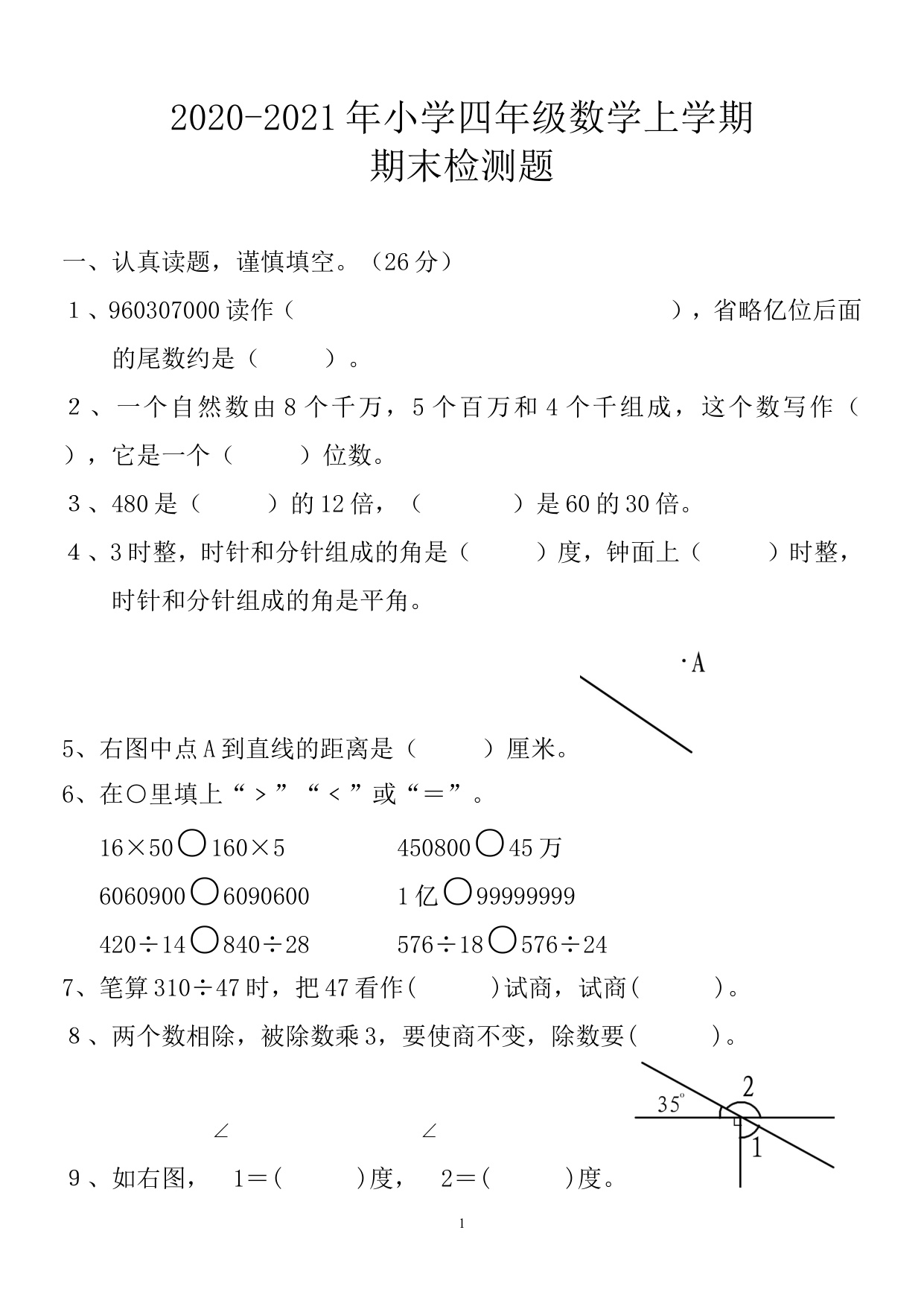 2020-2021学年度人教版四年级上册数学期末试卷1