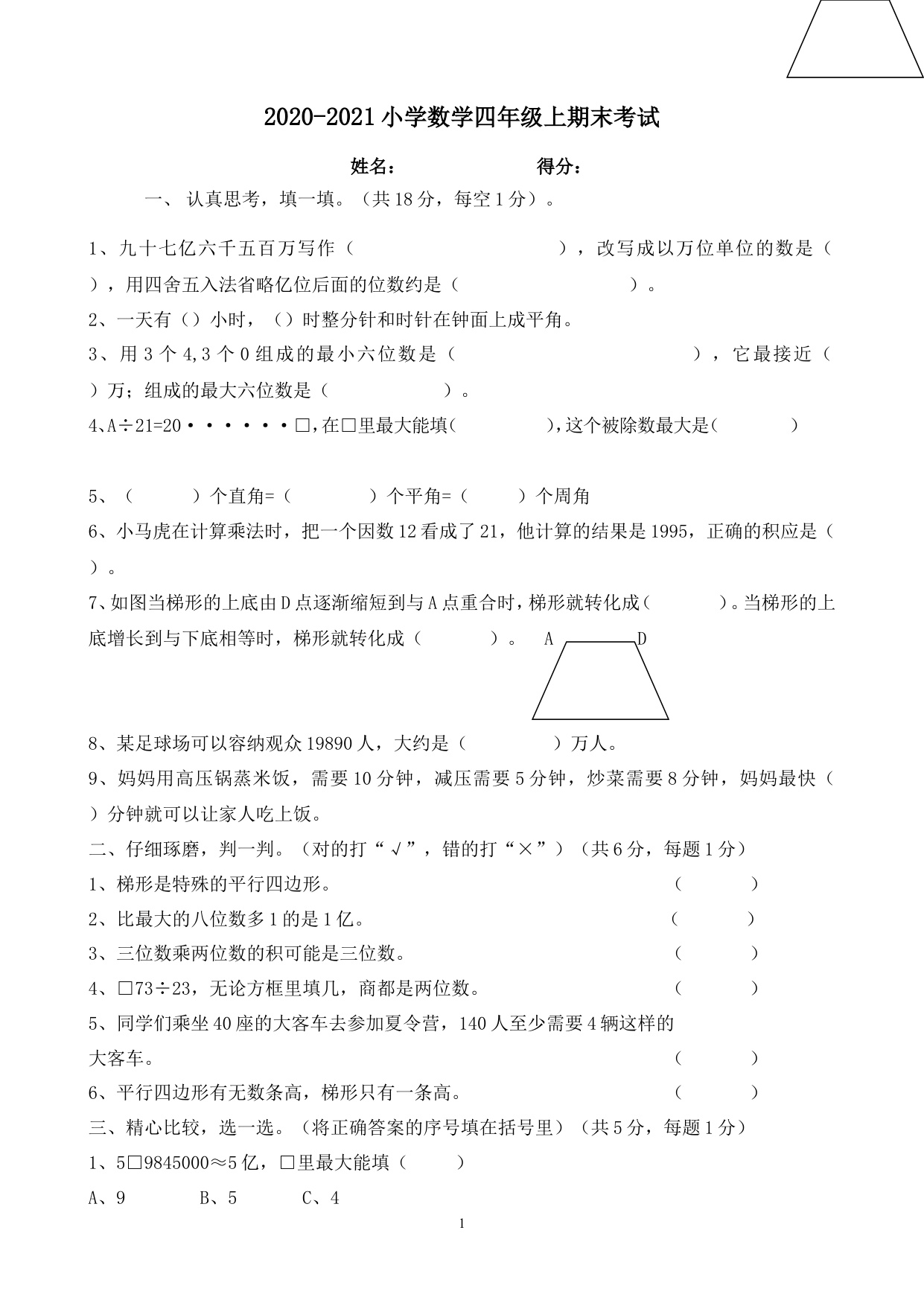 下一篇:2020-2021学年度人教版四年级上册数学期末试卷7