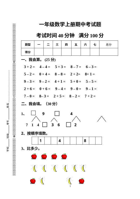 一年级上册上学期-人教版数学期中真题密卷(四)+答案版