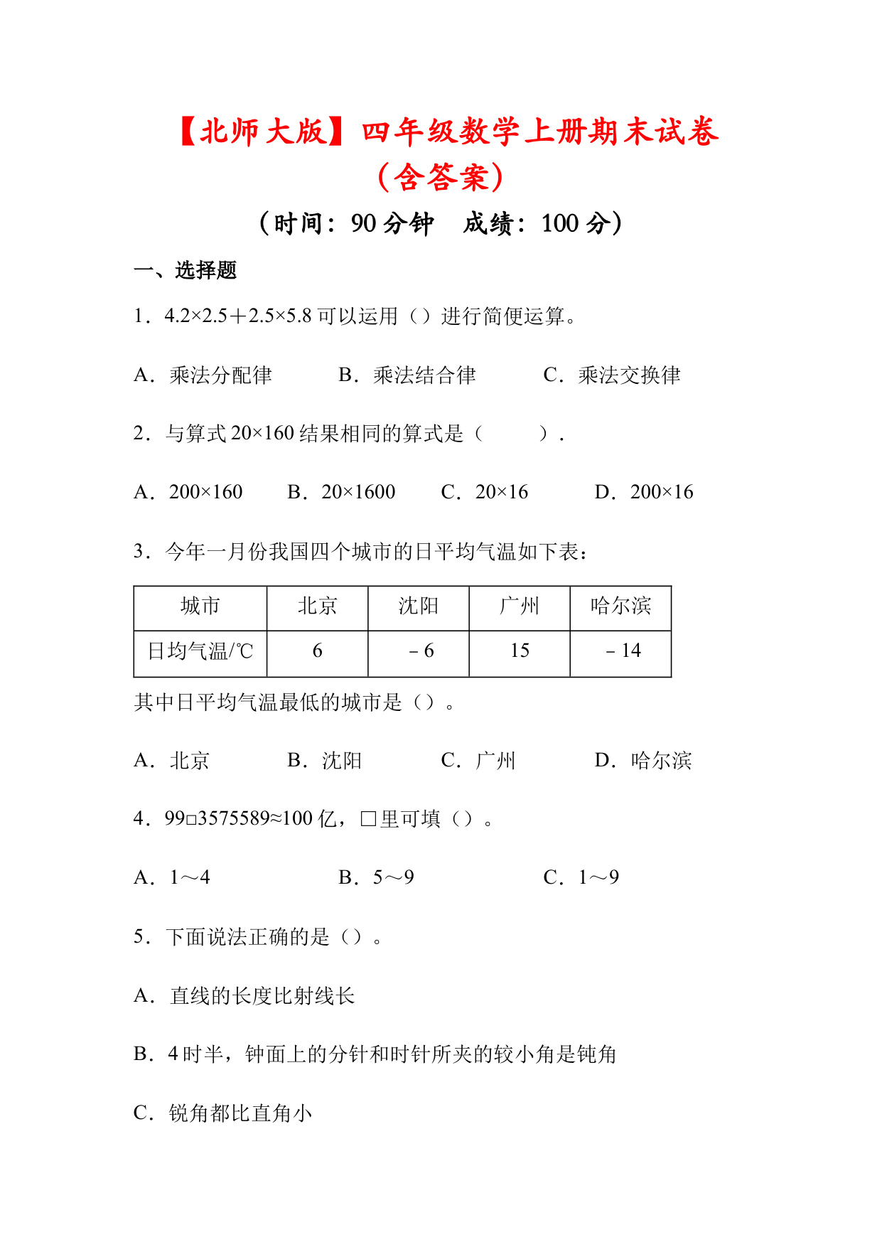上一篇:北师大版四年级数学上册期末试卷(含答案)