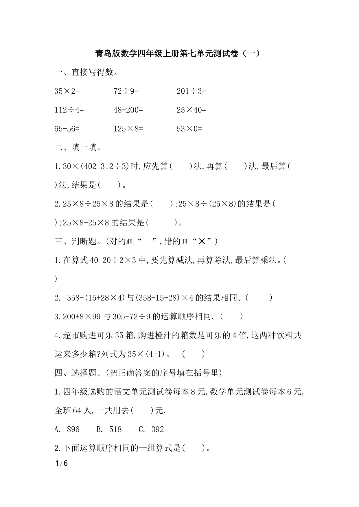 下一篇:青岛版数学四上第七单元测试卷(三)