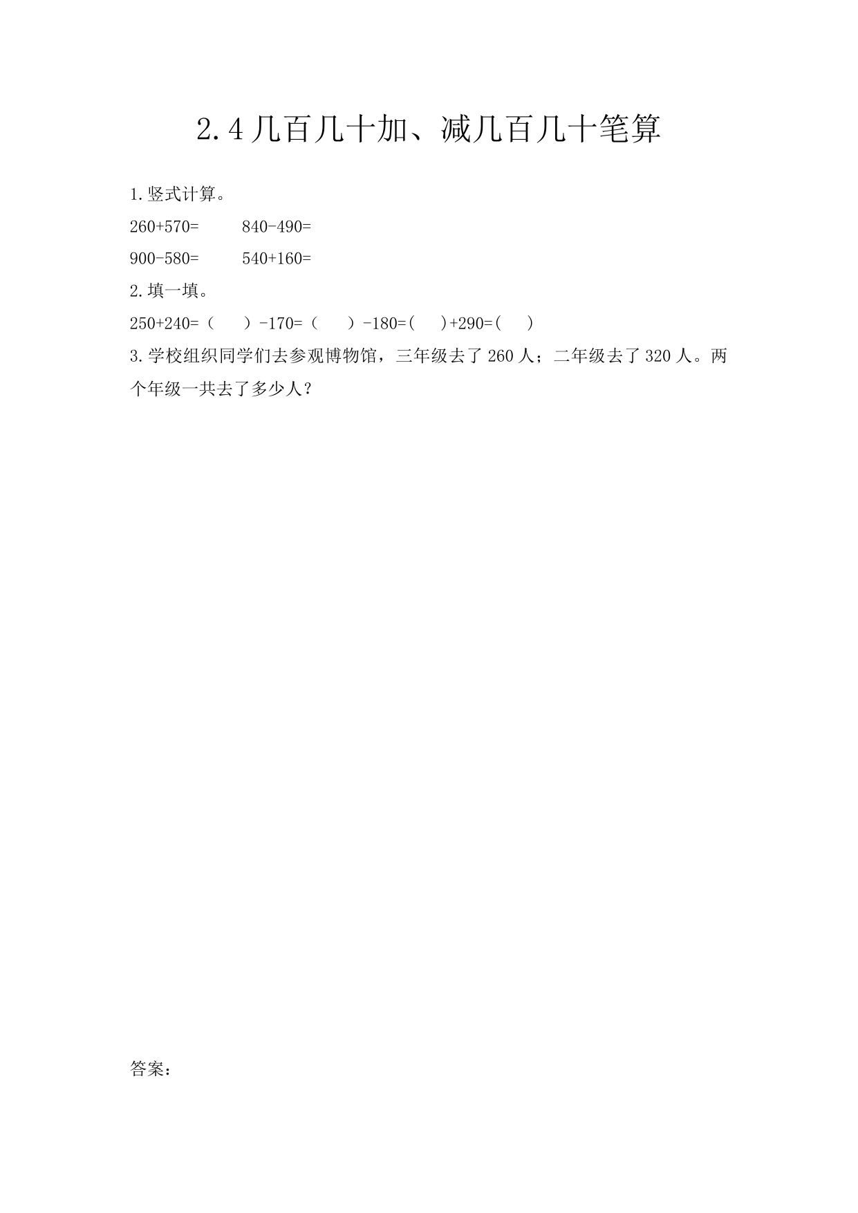 人教版数学三年级课时练2-4 几百几十加、减几百几十笔算