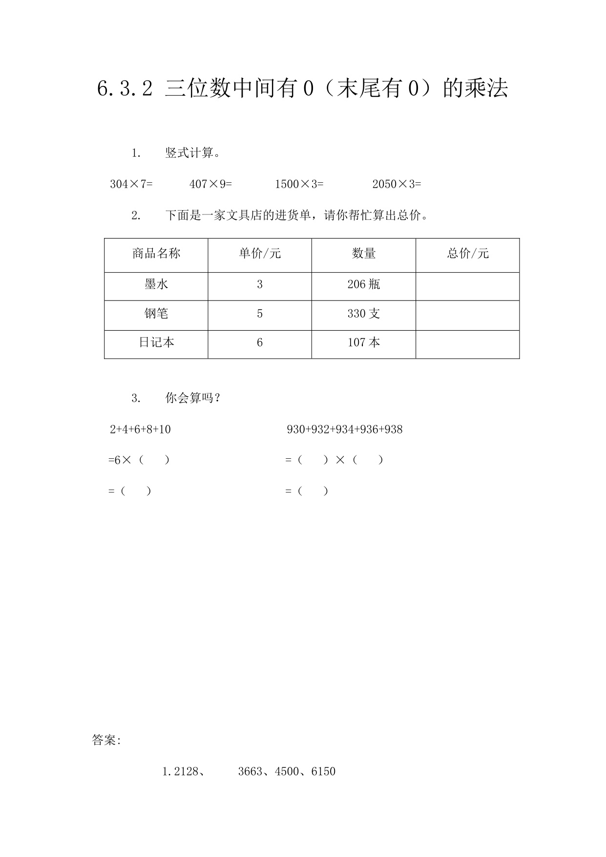 人教版数学三年级课时练6-3-2 三位数中间有0(末尾有0)的乘法 资料为Word格式,请下载后使用相应软件打开。