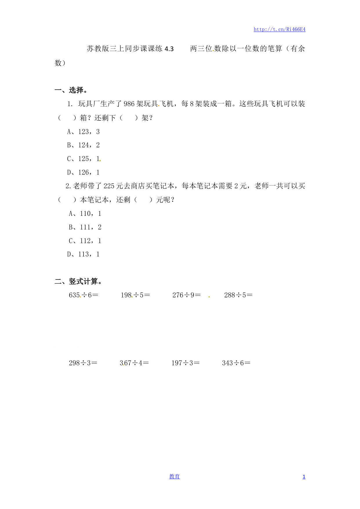 三年级上册数学一课一练-加油站4-3 两三位数除以一位数的笔算(有余数)-苏教版