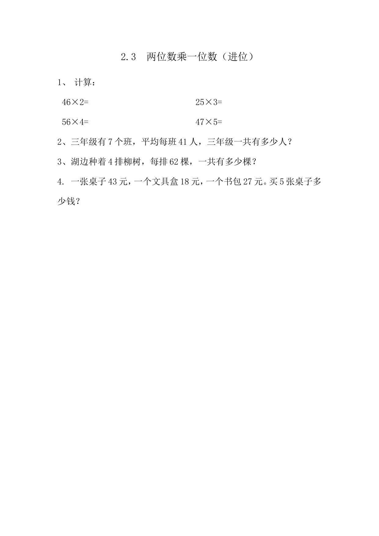 上一篇:青岛版三上数学课时练2-3 两位数乘一位数的进位乘法