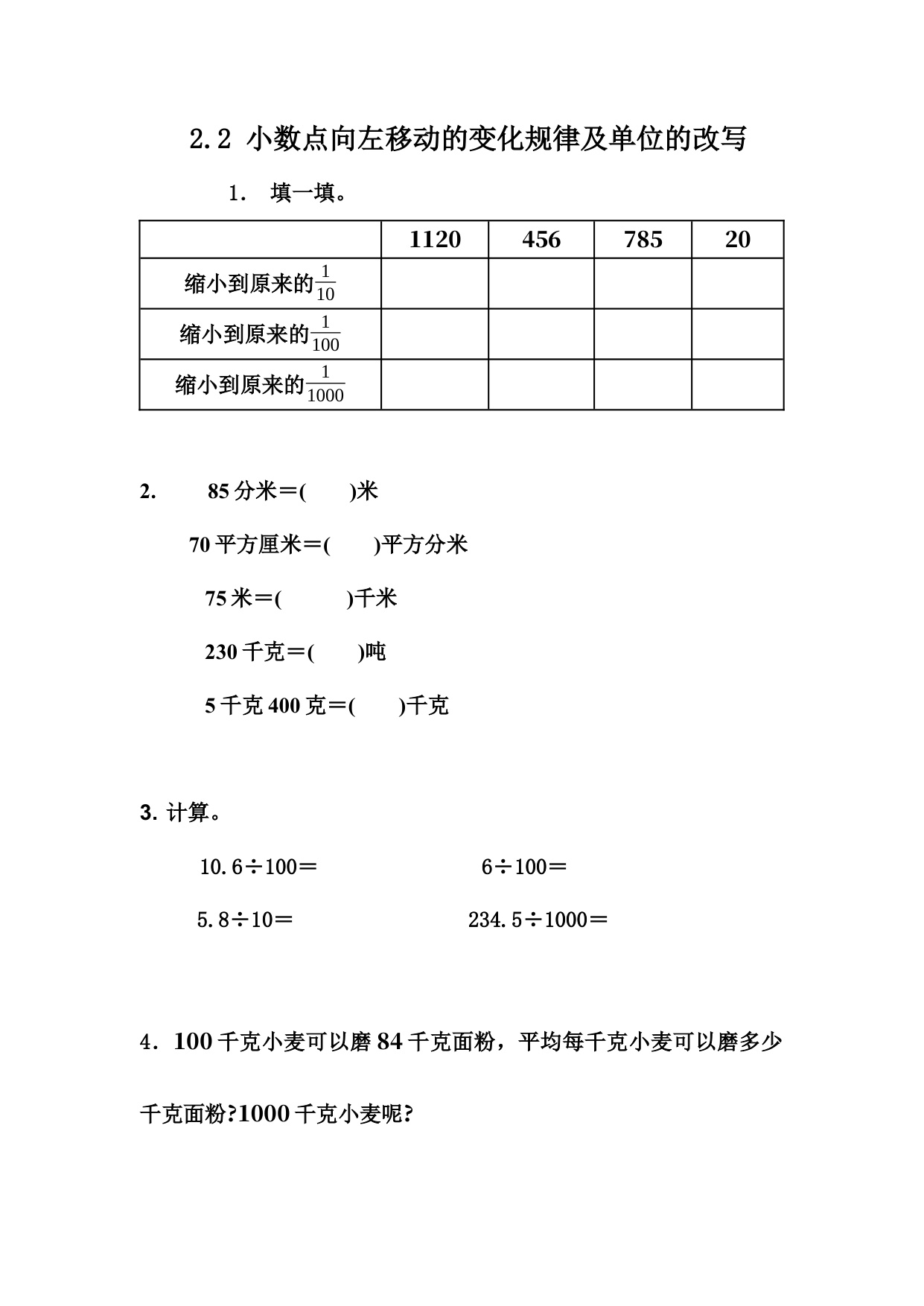 五上数学课时练2-2 小数点向左移动的变化规律及单位的改写