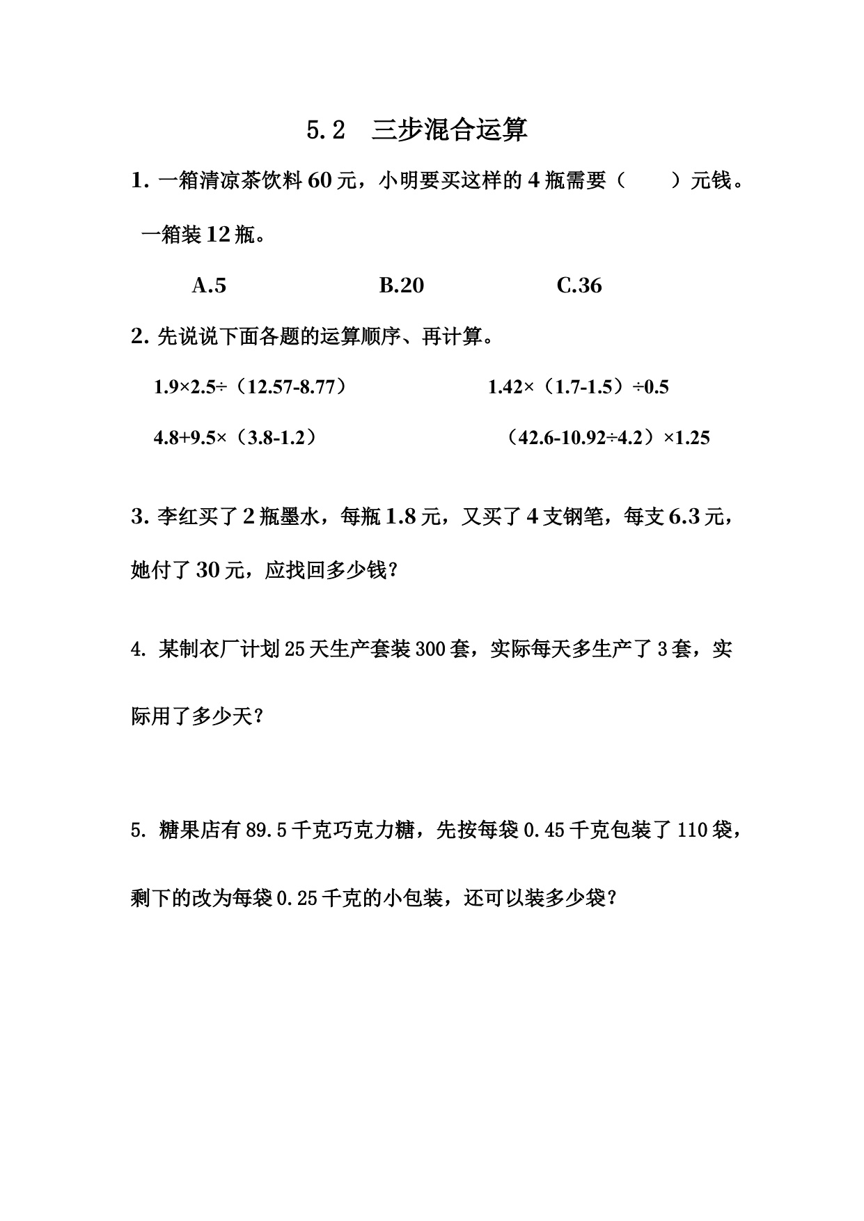 下一篇:五上数学课时练5-3 小括号内含有两级的三步混合运算