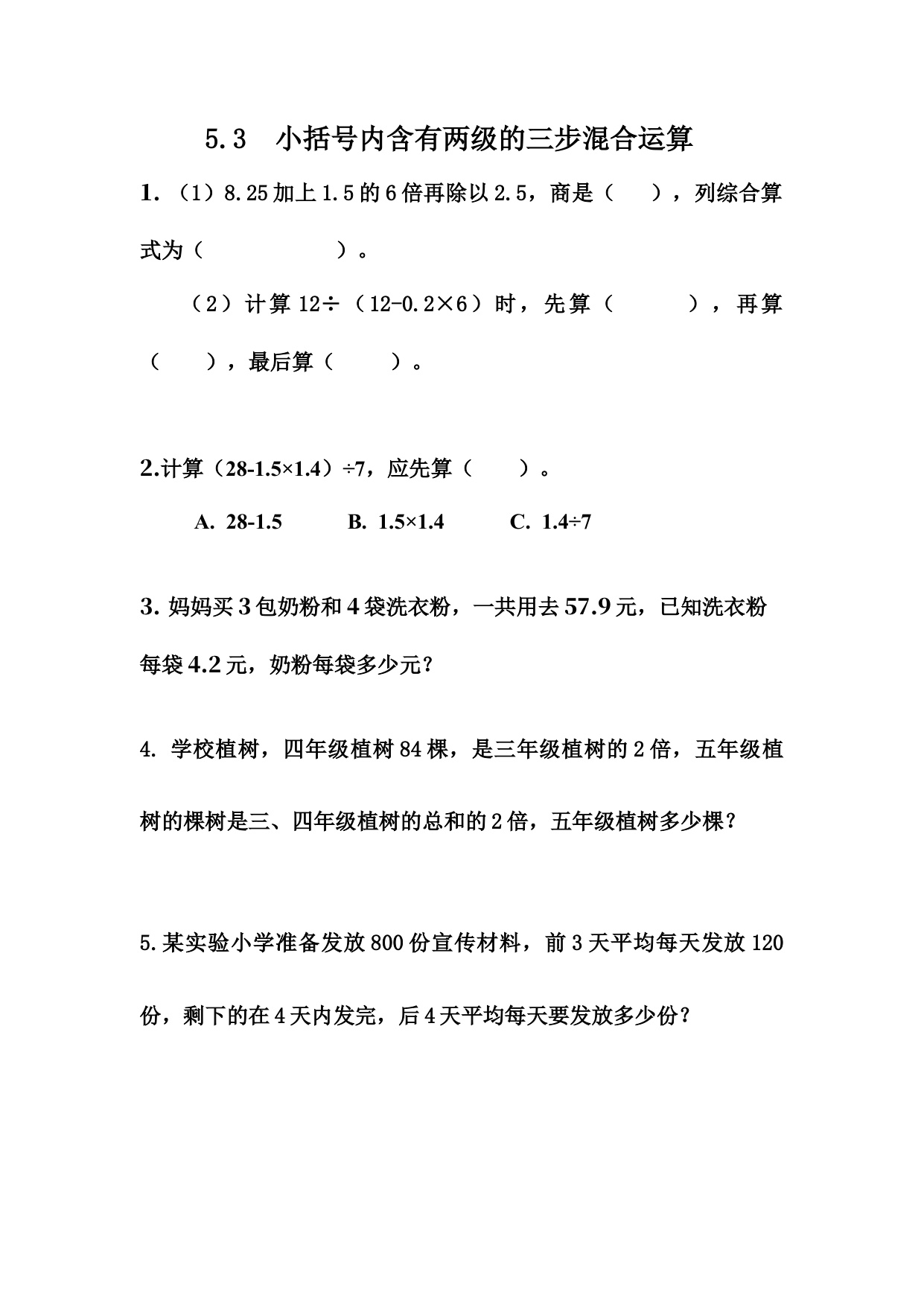 五上数学课时练5-3 小括号内含有两级的三步混合运算 资料为Word格式,请下载后使用相应软件打开。