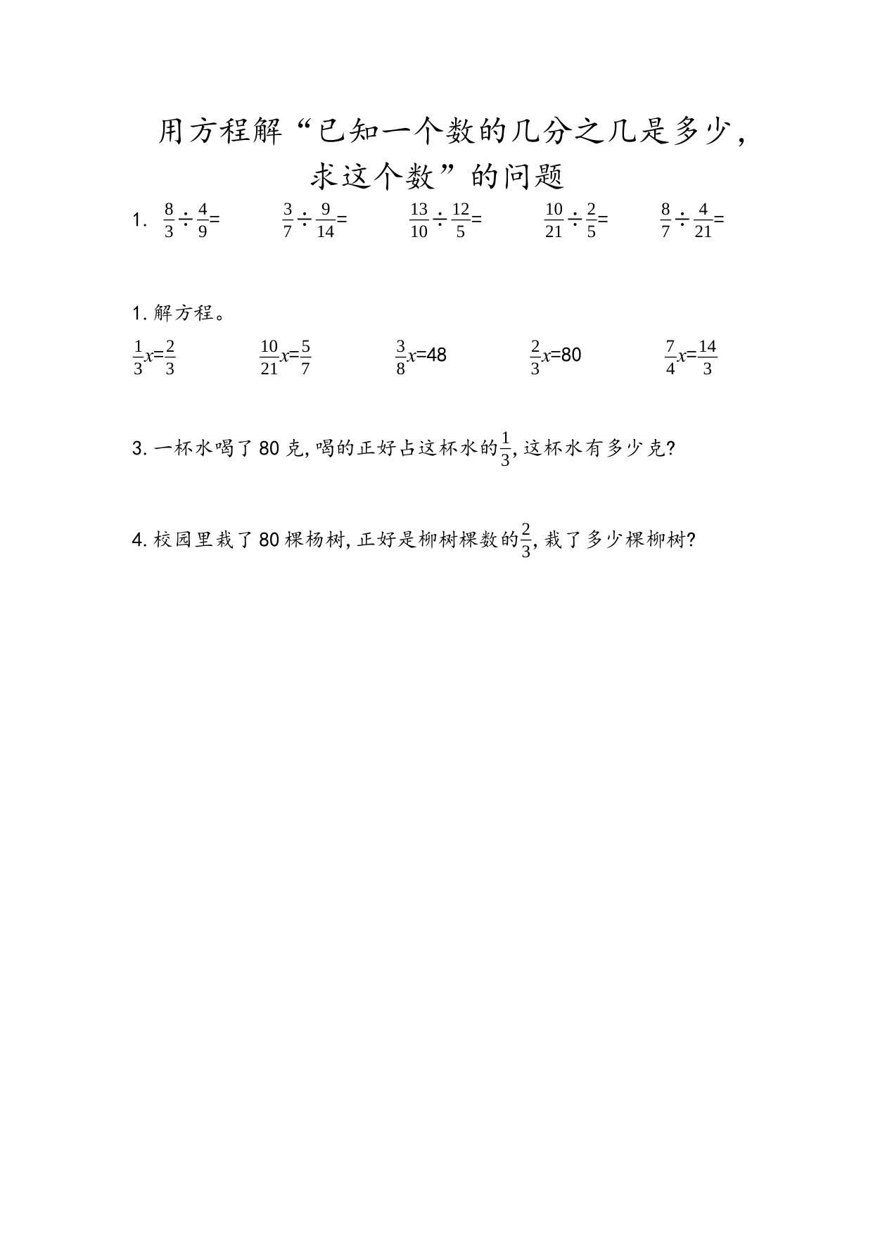 六上数学课时练3-4 用方程解“已知一个数的几分之几是多少,求这个数”的问题