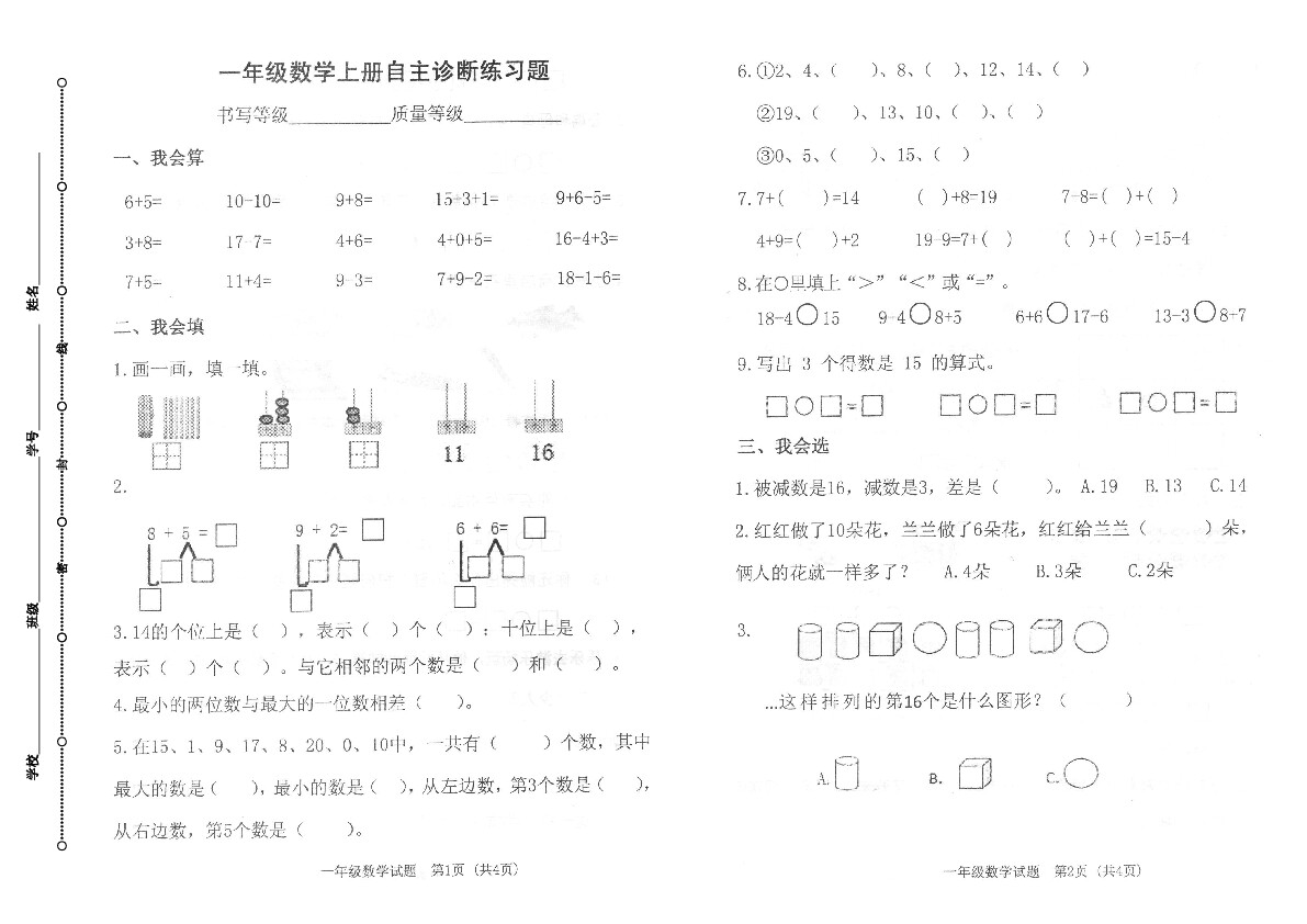 一年级上册数学期末试卷-山东潍坊真卷(PDF版无答案)