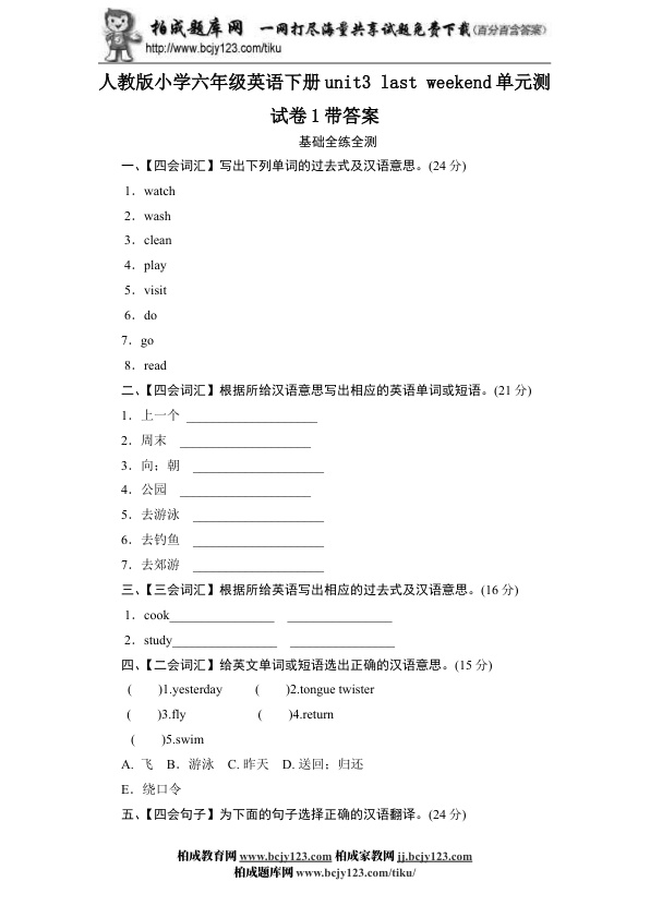 人教版小学六年级英语下册unit3 last weekend单元测试卷1带答案