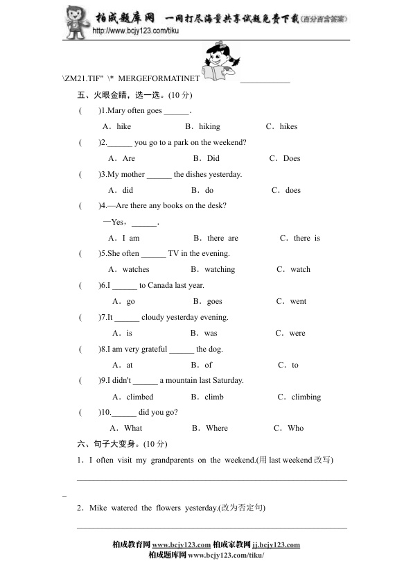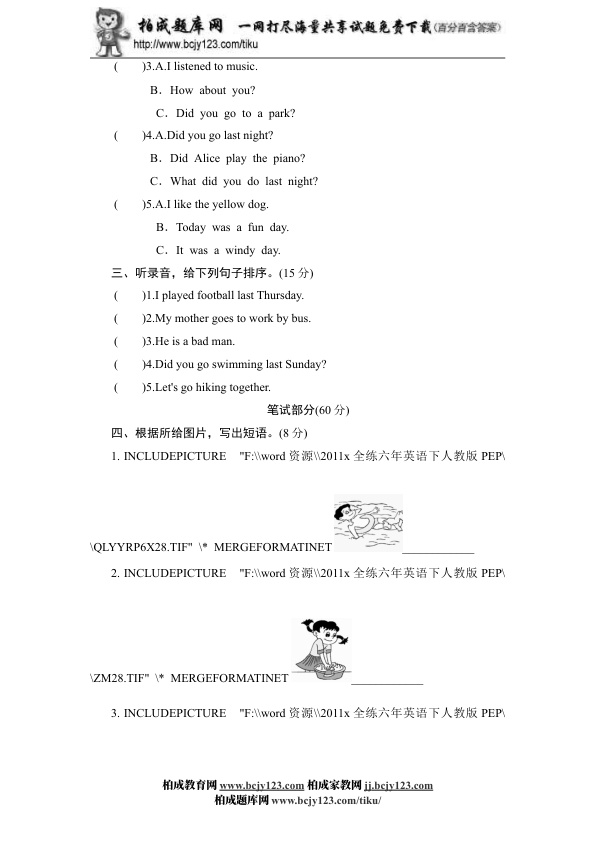 人教版小学六年级英语下册unit3 last weekend单元测试卷1带答案 资料为Word格式,请下载后使用相应软件打开。