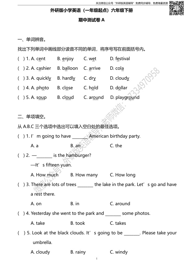 下一篇:外研版一起点六年级下册期中测试卷2及答案