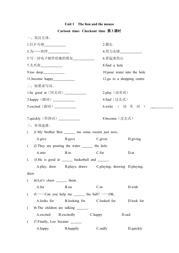 下一篇:【课时练习】六年级下册英语-Unit 1 The lion and the mouse 第二课时 Grammar time- Culture time 译林三起(word 含答案)