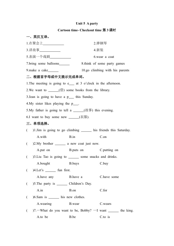 上一篇:【课时练习】六年级下册英语-Unit 5 A party 第一课时 Story time 译林三起(word 含答案)