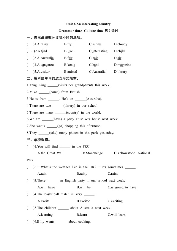 上一篇:【课时练习】六年级下册英语-Unit 6 An interesting country 第三课时 Cartoon time- Checkout time 译林三起(word 含答案)