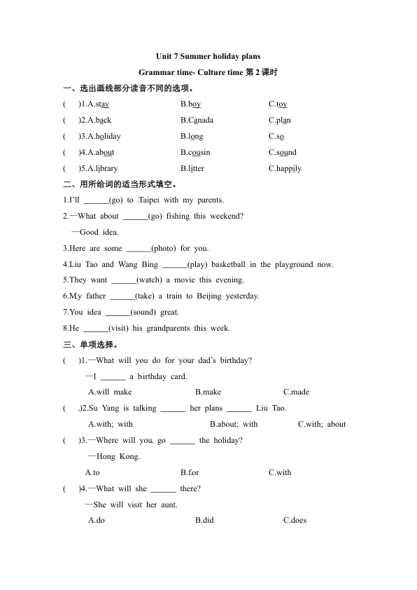 上一篇:【课时练习】六年级下册英语-Unit 7 Summer holiday plans 第三课时 Cartoon time- Checkout time 译林三起(word 含答案)