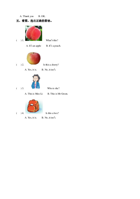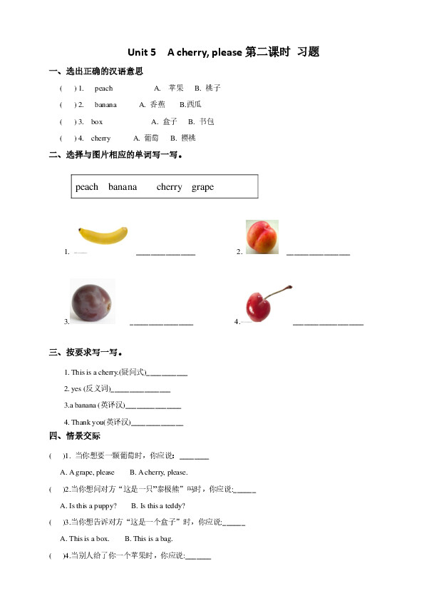 Unit 5 A cherry, please (2) 习题及答案 资料为PDF格式,请下载后使用相应软件打开。