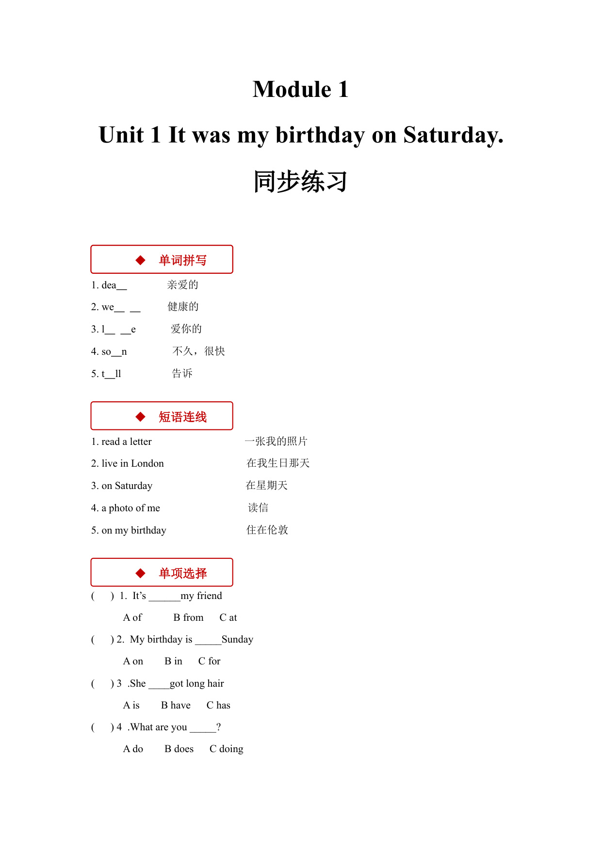 【同步练习】Module 1 Unit 1(外研英语一起点四上) 资料为Word格式,请下载后使用相应软件打开。