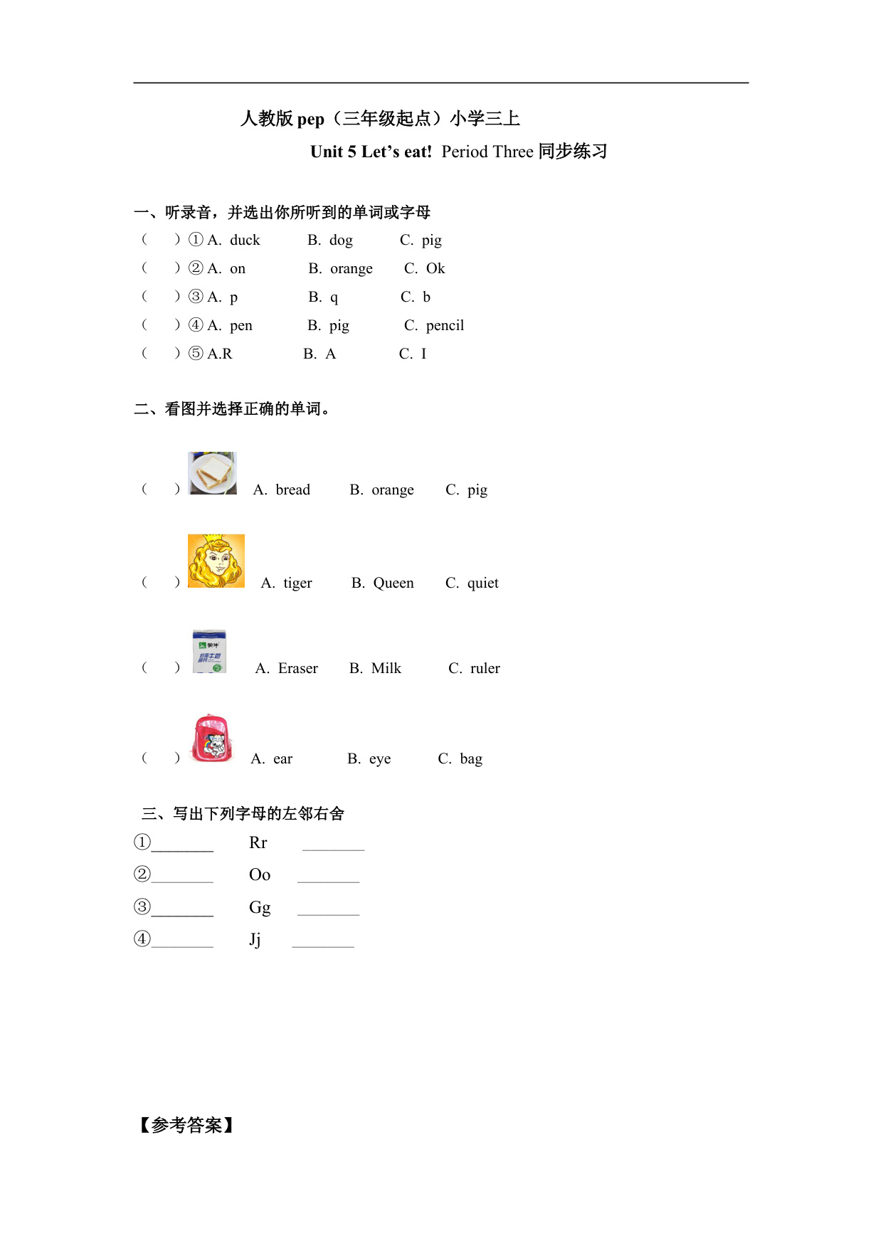 上一篇:人教版pep(三年级起点)小学三年级上册 Unit 5 Let is eat Period Six 同步练习含答案