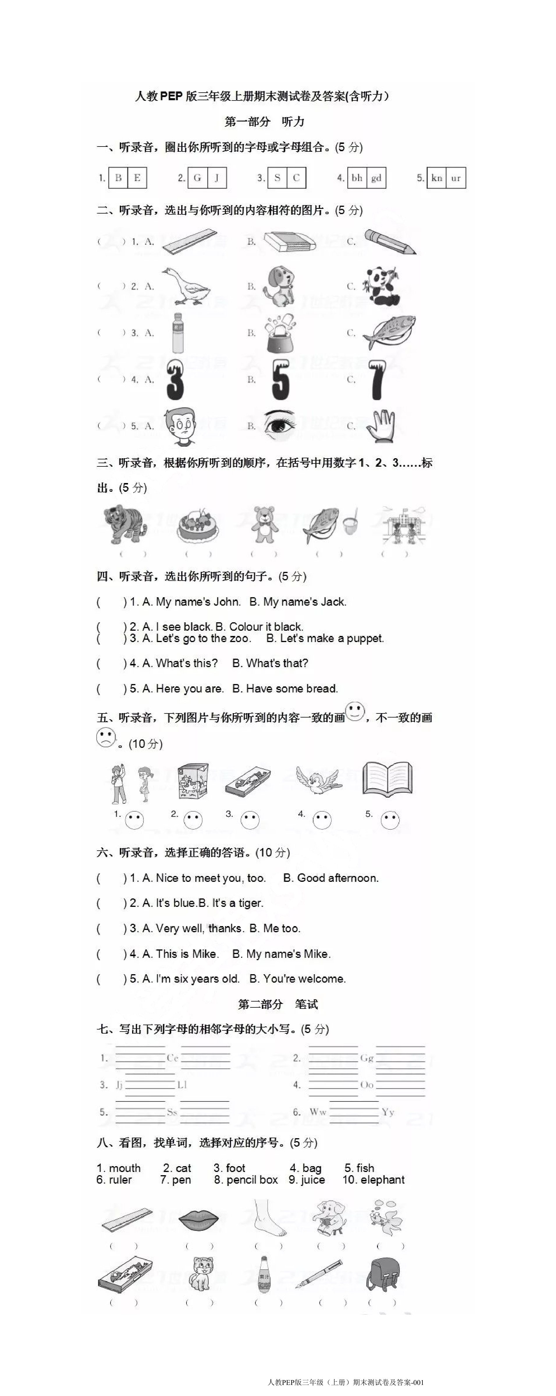 人教PEP版三年级(上册)期末测试卷及答案含听力MP3文件