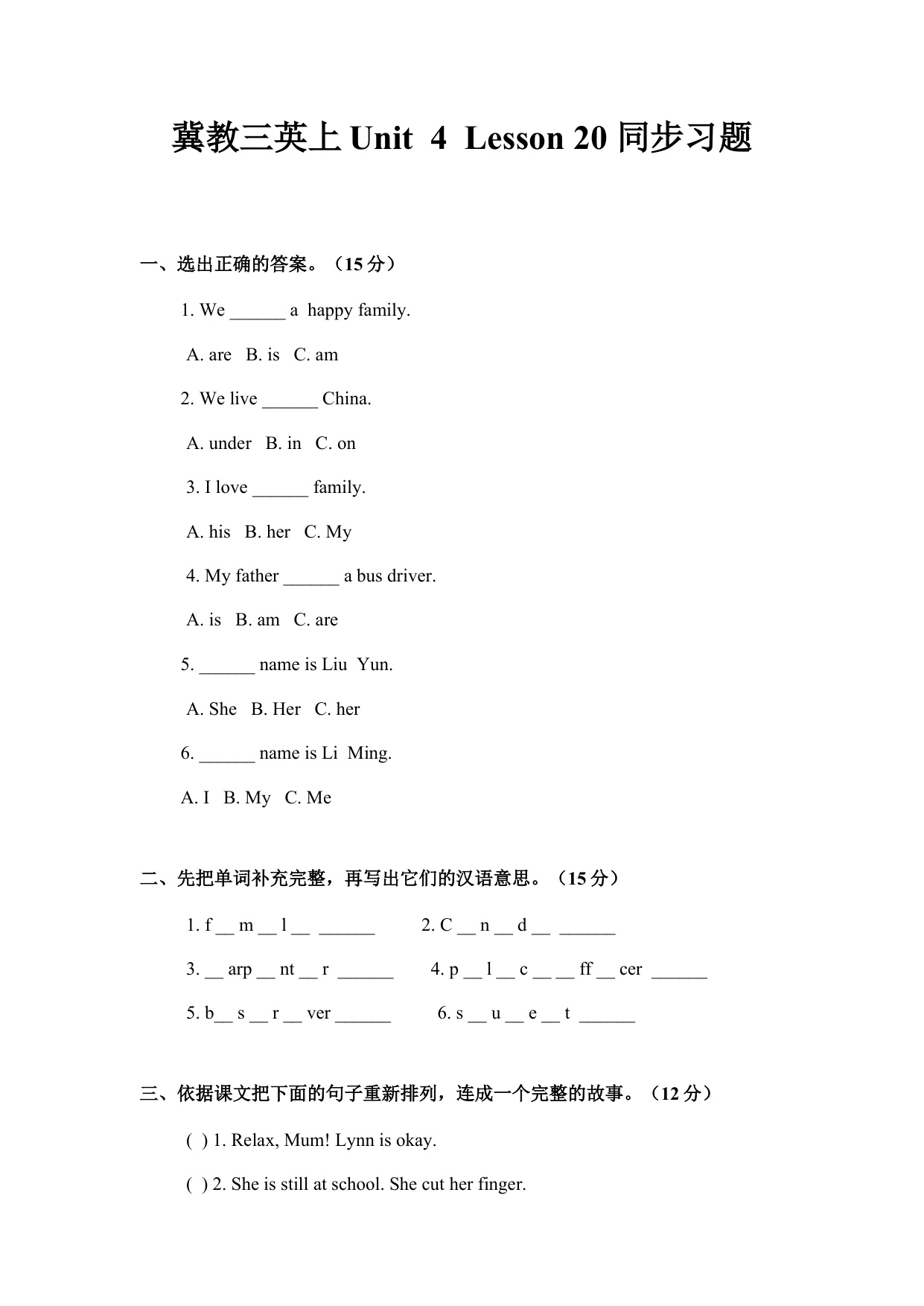 冀教三英上Unit 4 Lesson 20 同步习题