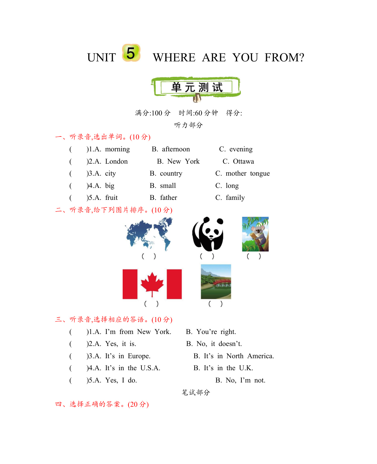 上一篇:北京课改五上 Unit 4 测试卷含听力