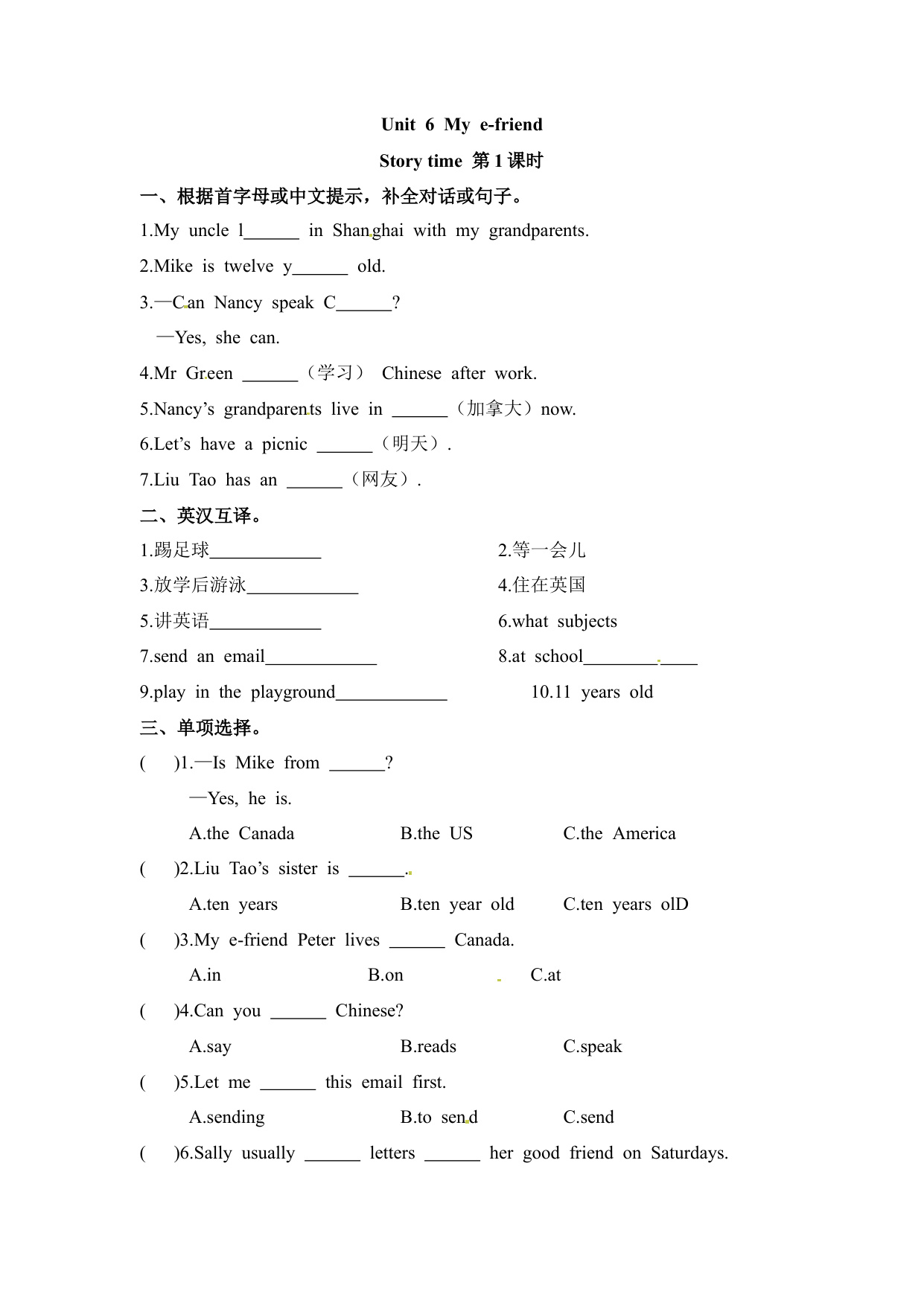 下一篇:一课一练第一套-Unit 6 My e-friend 课时2 Grammar time-Cultural time 译林三起(含答案)(五年级英语上册)