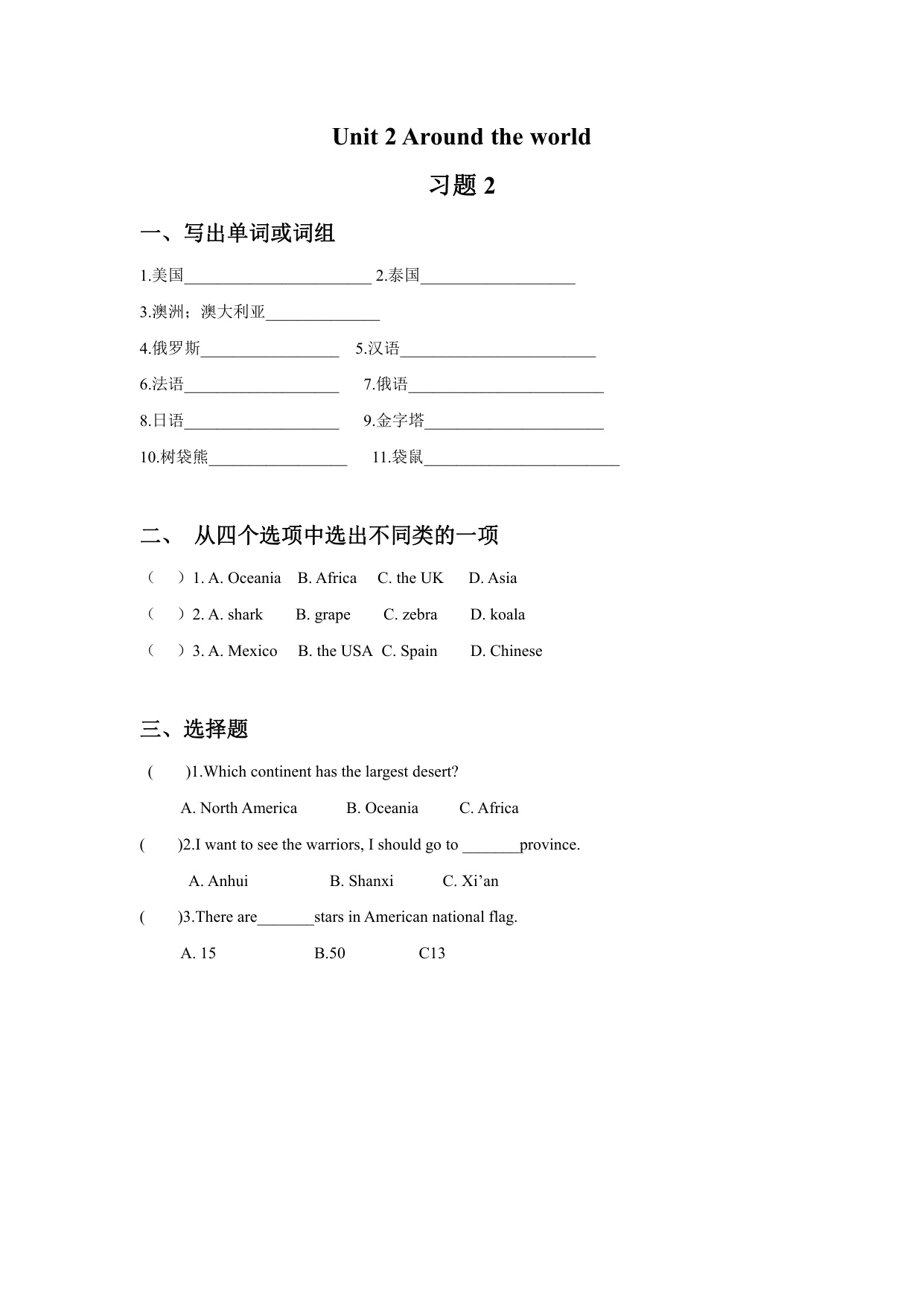 上一篇:六年级上册英语Unit 2 Around the world 习题 1