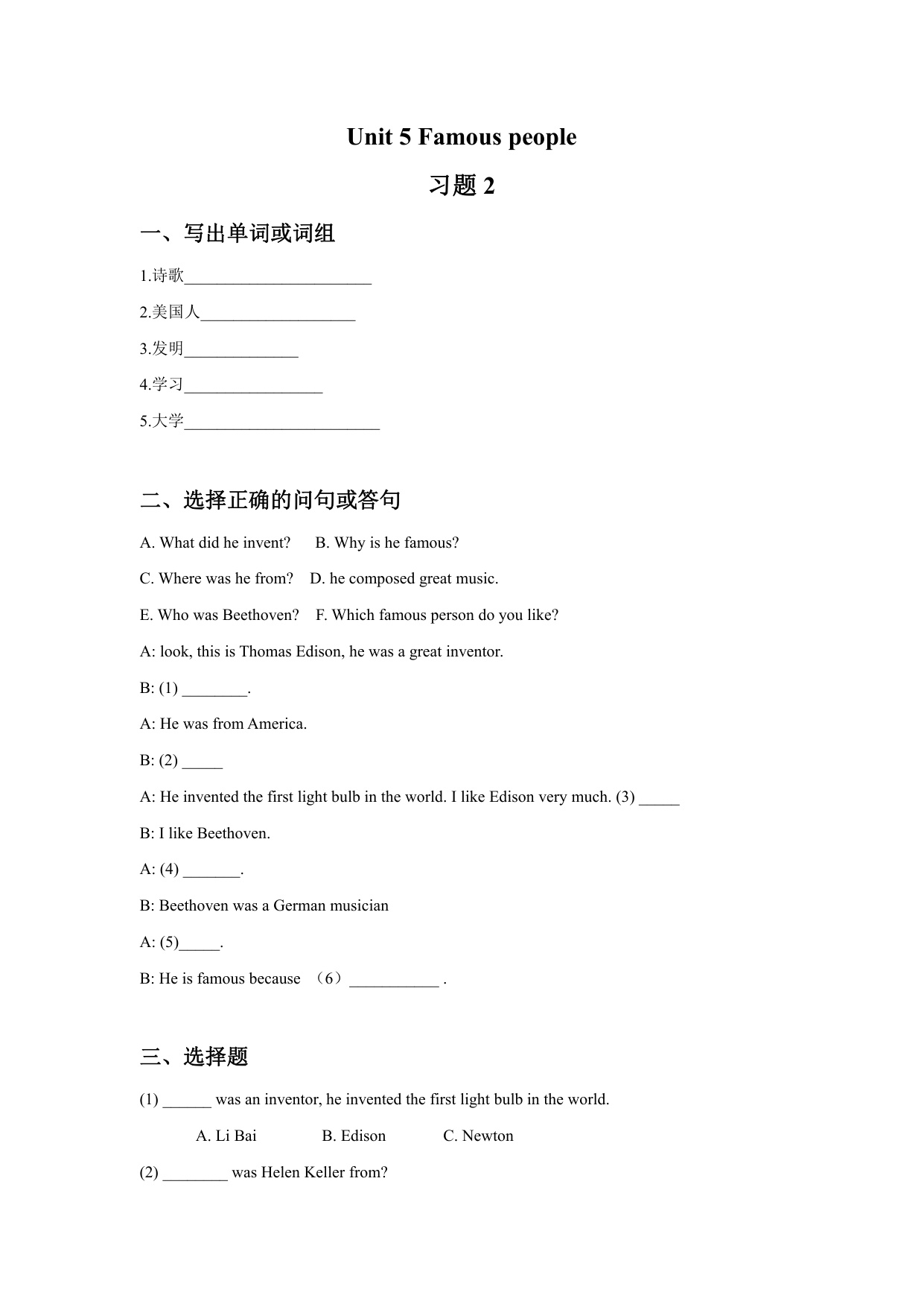上一篇:六年级上册英语Unit 5 Famous people 习题 1