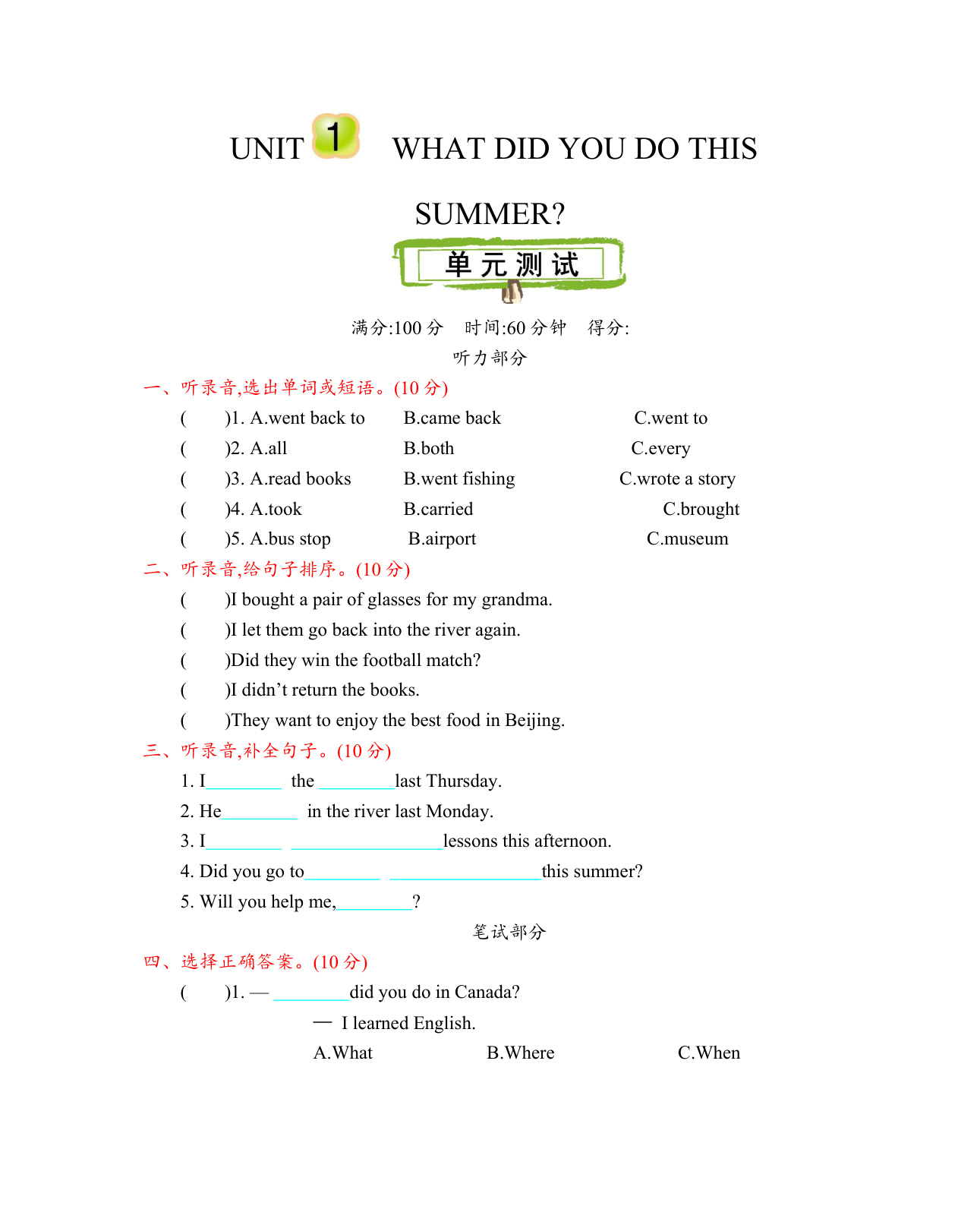 下一篇:北京课改六上 Unit 2 测试卷含听力