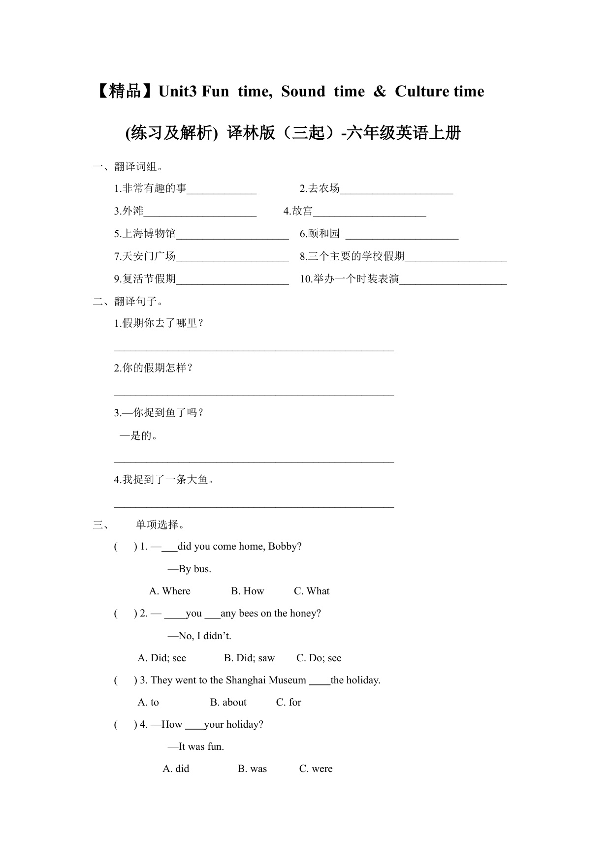 一课一练-Unit3 Fun time, Sound time & Culture time (练习及解析)译林版(三起)-六年级英语上册 资料为Word格式,请下载后使用相应软件打开。
