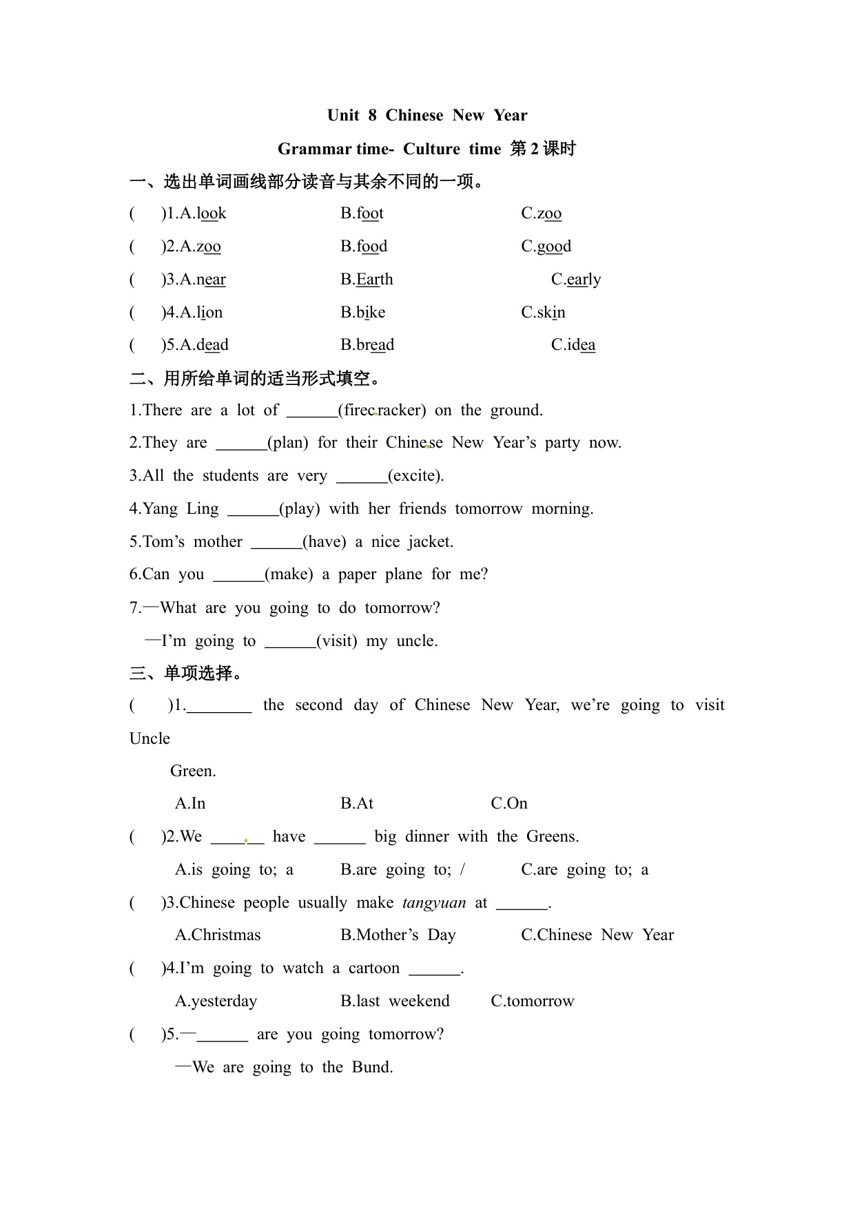 下一篇:六年级上册英语课时练-Unit 8 Chinese New Year 课时3 Cartoon time- Ticking time 译林三起(含答案)