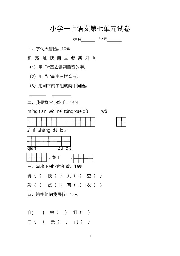 上一篇:一年级上册-语文-第一单元考试试卷