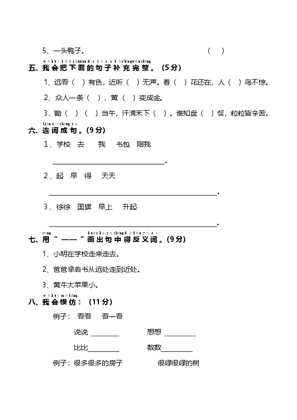 部编版小学语文1年级上册第五单元提高检测卷及答案(能力提升)
