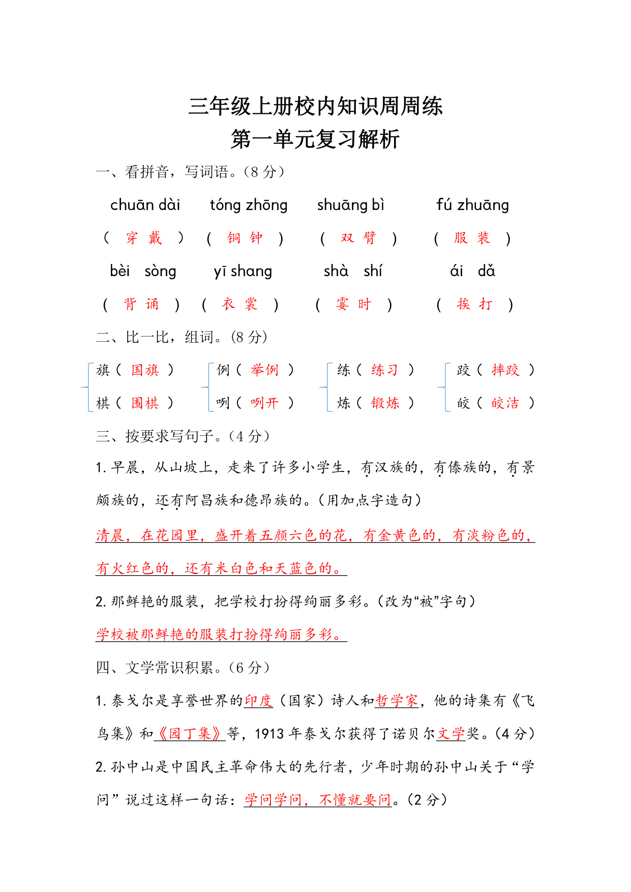 【语文基本功训练营】—三年级上册校内知识周周练第1单元复习解析(部编版)
