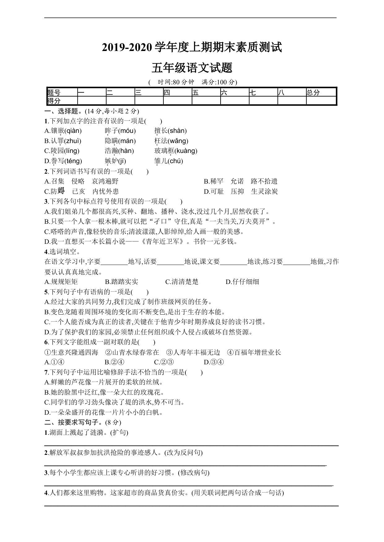 下一篇:五年级上册语文期末测试卷及答案(5)