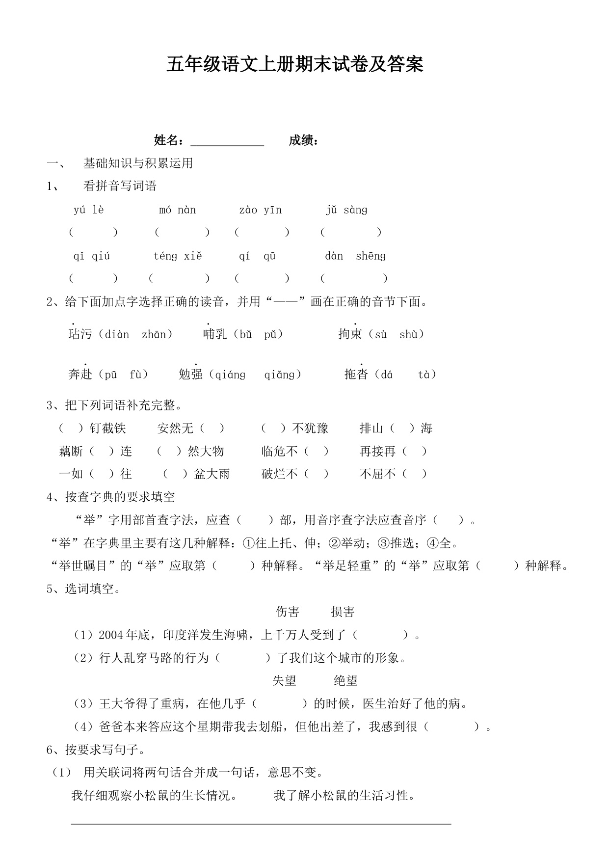 上一篇:五年级上册语文期末测试卷及答案(6)