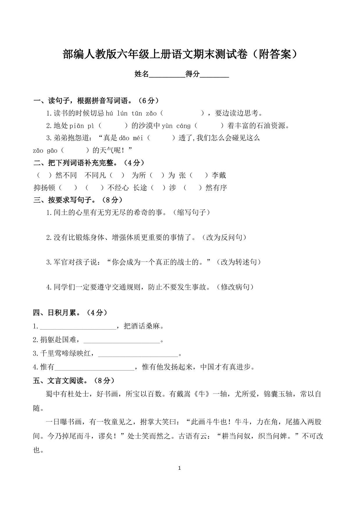 下一篇:部编版六年级上册语文《期末测试卷》含答案